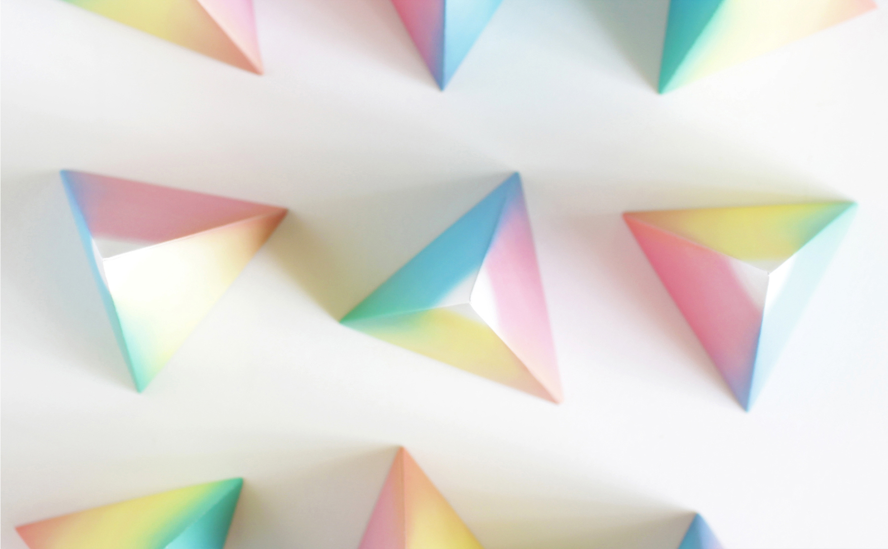 3角のそれぞれの面の色は、隣の面との境で混ざりつながる。様々な色がつながるイメージを、箱の3面で表現しました。